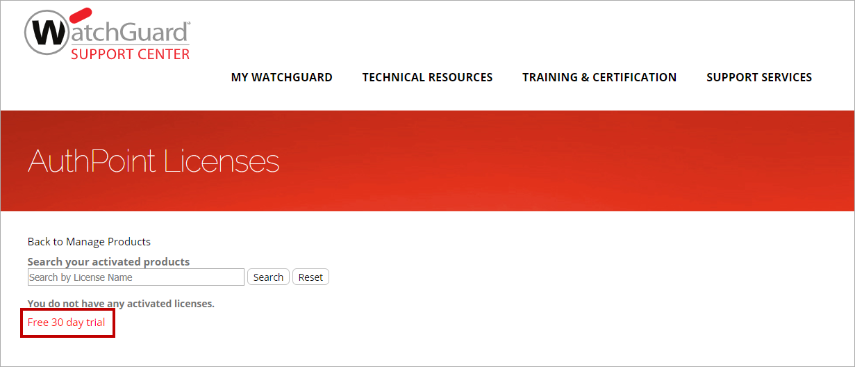 Para comenzar con AuthPoint, debe activar una licencia de prueba de AuthPoint en el WatchGuard Support Center. Siga estos pasos para activar una licencia de prueba de AuthPoint para su cuenta.