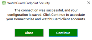 - Para asociar sus cuentas de ConnectWise y WatchGuard, haga clic en Continue. Para más información sobre cómo asignar clientes, vaya a Asignar Clientes de ConnectWise Automate y Cuentas de WatchGuard Cloud.