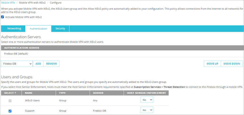 Por ejemplo, la política SSH Traversal en la sección Políticas que Permiten Conexiones desde las VLAN funciona para el grupo de Soporte independientemente de si están dentro de la red o en una VPN. Esto funciona si agrega el grupo de usuarios de Soporte en la configuración de Mobile VPN with IKEv2.