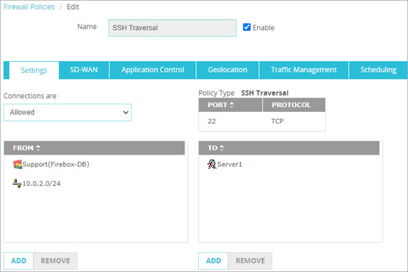 En esta política de ejemplo, permitimos que solo el grupo de usuarios de Soporte y los hosts en la subred 10.0.2.0/24 hagan una conexión SSH a un servidor (Servidor1) en la subred 10.0.3.0/24.