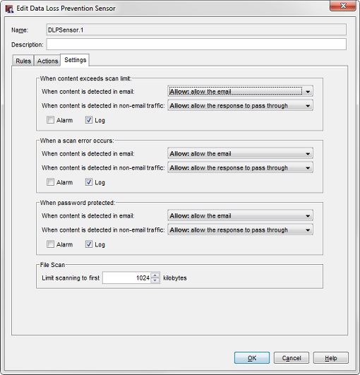 En cada DLP Sensor definido por el usuario, puede cambiar la configuración que controlan la manera en que el DLP escanea el contenido, y qué acción tomar si el contenido no se puede escanear.