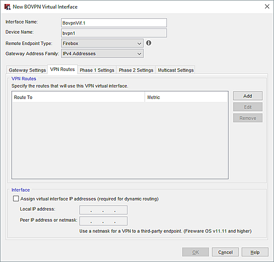 Estos ajustes se configuran de manera diferente para un BOVPN entre un Firebox y una VPN par de terceros. Para más información, consulte Direcciones IP de Interfaz Virtual para una VPN a un Endpoint de Terceros.