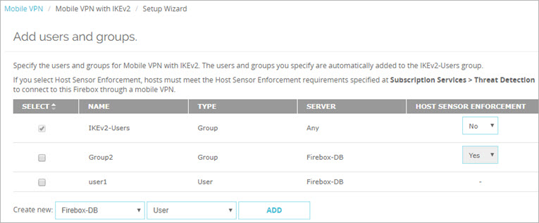 - Seleccione o agregue los usuarios o grupos para Mobile VPN with IKEv2.