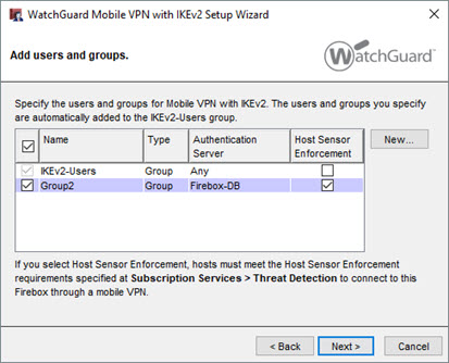 Cuando habilita Mobile VPN with IKEv2, Firebox crea automáticamente un grupo de usuarios llamado IKEv2-Users.. Puede agregar otros usuarios y grupos en la configuración de IKEv2. El Firebox incluye automáticamente a esos usuarios y grupos en el grupo IKEv2-Users.