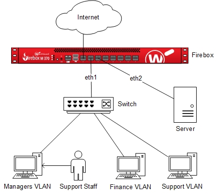 Por ejemplo, un técnico de soporte de TI debe resolver un problema en la computadora de un gerente, que está en una VLAN llamada VLAN de Gerentes. Para completar una tarea en la computadora del gerente, el técnico debe realizar temporalmente una conexión SSH a un servidor en una subred diferente. La política del Firebox para el tráfico a ese servidor no permite el tráfico de computadoras en la VLAN de Gerentes. Sin embargo, la política del Firebox permite el tráfico tanto del grupo de usuarios de Soporte como de la VLAN de Soporte. Debido a que el técnico es miembro del grupo de usuarios Soporte, puede conectarse a ese servidor desde cualquier computadora en la red, incluida una computadora en la VLAN de Gerentes.