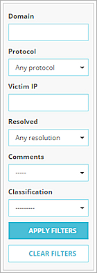 Puede filtrar la lista de alertas por dominio, protocolo, dirección IP de la víctima, estado de la resolución, comentarios y clasificación.