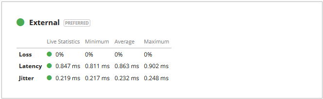 Si todos los iconos de pérdida, latencia y oscilación están en verde, el icono de red estará en verde. El color verde indica que la red está calificada, lo que significa que está disponible para la selección de rutas de Operación por Turnos de SD-WAN o de Conmutación por Error de SD-WAN.