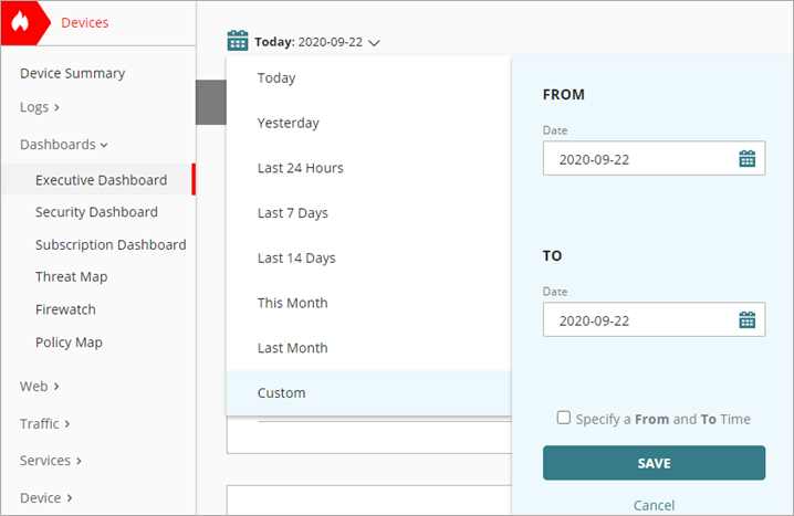 Los informes y paneles de control de WatchGuard Cloud muestran datos de la fecha actual de forma predeterminada. Para ver los datos de un período de tiempo diferente, puede seleccionar un período predefinido o especificar un intervalo de fechas personalizado.