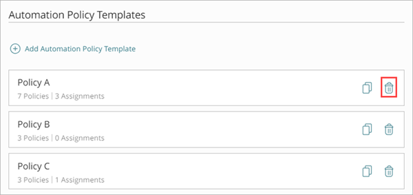 En la página Plantillas de Política de Automatización, puede eliminar una plantilla de automatización si no está asignada a ninguna cuenta que administre.