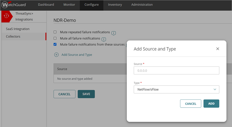 Screen shot of Configure > ThreatSync, Add ThreatSync+ NDR Collection Agents dialog box