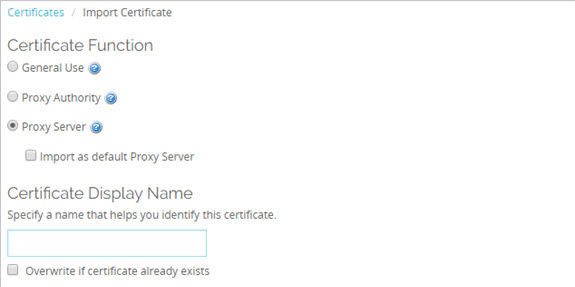 - Pour en faire le certificat de serveur proxy par défaut, cochez la case Importer comme serveur proxy par défaut. Cela supprimera la possibilité de spécifier un Nom Complet du Certificat.