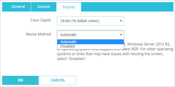 - Pour modifier la Méthode de Redimensionnement, sélectionnez Automatique ou Désactivé dans la liste déroulante. Si vous conservez le paramètre par défaut Automatique, la session redimensionne automatiquement la fenêtre RDP.