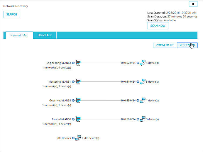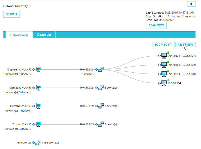 Une fois votre réseau analysé, les périphériques s'affichent dans les onglets Carte du Réseau et Liste des Périphériques. Les périphériques restent dans la carte et la liste jusqu'à ce qu'ils soient supprimés parce que :