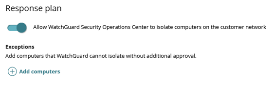 Lorsque vous utilisez WatchGuard Endpoint Security et configurez les paramètres WatchGuard Core MDR d'un client dans WatchGuard Cloud, vous pouvez opter pour autoriser l'équipe du SOC à isoler automatiquement les ordinateurs du réseau du client lorsqu'un incident se produit. Pour de plus amples informations concernant la modification des paramètres WatchGuard Core MDR, accédez à Configurer les Paramètres de WatchGuard Core MDR.