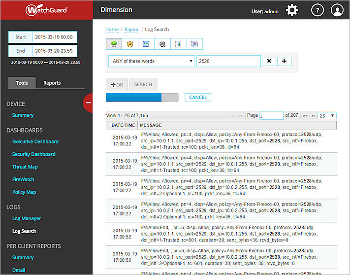 Si vous vous trouvez à la page des messages de journal d'un Firebox dans Log Manager, vous pouvez utiliser la zone de texte Rechercher pour lancer une recherche.