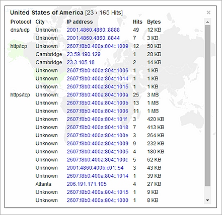 Une fois que vous avez sélectionné une option dans la Carte des Menaces, vous pouvez cliquer sur les détails (tel que le pays ou une adresse IP) pour obtenir des informations supplémentaires. Pour un pays, ceci comprend une liste des protocoles, des villes, les adresses IP et des visites. Pour une adresse IP, ceci comprend une liste de toutes les visites, qu'il s'agissent de l'adresse source ou de destination, et que le trafic ait été autorisé ou refusé.