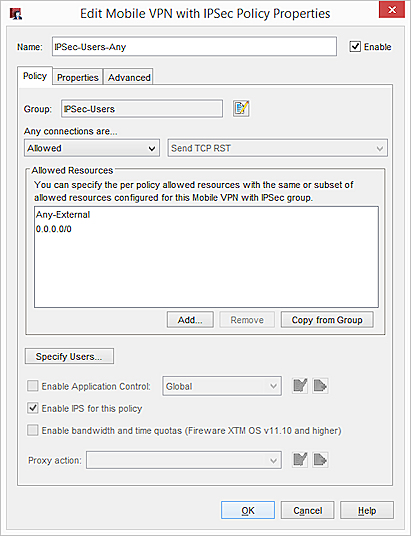 Vous pouvez uniquement sélectionner les utilisateurs du serveur d'authentification spécifié dans le groupe Mobile VPN. - Mettez les autres propriétés de la stratégie à jour comme indiqué dans À propos des Propriétés de Stratégie.
