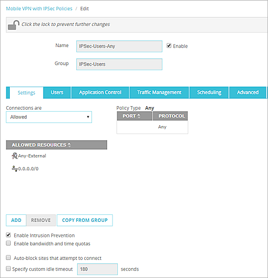 - Double-cliquez sur la stratégie Tout associée au groupe Mobile VPN with IPSec.