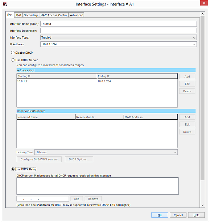 Dans Fireware v12.1.1 et les versions ultérieures, vous pouvez spécifier des serveurs relais DHCP pour chaque interface. Les serveurs relais DHCP spécifiés s'appliquent uniquement aux requêtes DHCP reçues sur cette interface.
