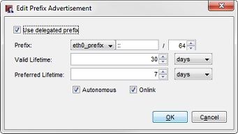 Vous pouvez utiliser un préfixe délégué lorsque vous ajoutez une annonce de préfixe. Si vous utilisez un préfixe délégué pour une adresse IPv6 statique et que vous cochez la case Ajouter une annonce de préfixe pour cette adresse IPv6 statique, une annonce de préfixe qui utilise également le préfixe délégué est ajoutée.