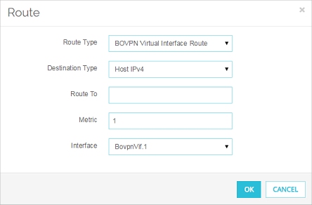 Si vous avez configuré une interface virtuelle BOVPN, vous pouvez également ajouter et modifier les routes d'une interface virtuelle BOVPN ici. Cette option est disponible uniquement après avoir configuré au moins une interface virtuelle BOVPN. Pour plus d'informations, consultez Configurer une Interface Virtuelle BOVPN.