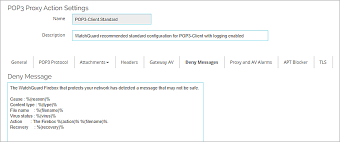 Lorsqu'un contenu est refusé, le Firebox envoie un message de refus par défaut qui remplace le contenu refusé. Ce message apparaît dans l'e-mail d'un destinataire lorsque le proxy bloque un e-mail. Vous pouvez changer le texte de ce message de refus. La première ligne du message de refus est une section de l'en-tête du message. Vous devez inclure une ligne vide entre la première ligne et le corps du message.