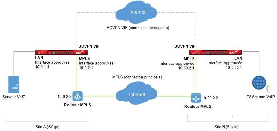 Dans cet exemple, une entreprise avec un trafic VoIP entre différents sites désire offrir à ses utilisateurs des appels audio fiables et de bonne qualité via une connexion sécurisée. Pour atteindre ces objectifs, l'entreprise dédie une liaison MPLS au trafic VoIP. En cas de problème réseau sur la liaison MPLS (pertes, latence ou instabilité), l'entreprise souhaite basculer le trafic VoIP vers une autre interface. Pour réduire ses dépenses, elle désire utiliser un tunnel d'interface virtuelle BOVPN en tant que connexion de secours au lieu d'une liaison MPLS secondaire.