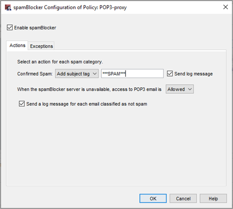 Après avoir activé spamBlocker dans vos stratégies de proxy POP3, IMAP ou SMTP, vous pouvez modifier les paramètres spamBlocker utilisés pour chaque action de proxy.