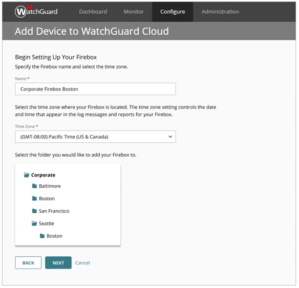 Caution: Lorsque vous ajoutez un Firebox géré sur le cloud, vous créez une nouvelle configuration dans WatchGuard Cloud. Il est impossible de migrer une configuration de périphérique existante vers WatchGuard Cloud. Pour plus d'informations sur la façon de faire passer un Firebox existant de la gestion locale à la gestion sur le cloud, accédez à Migrer un Firebox Géré Localement vers la Gestion sur le Cloud.
