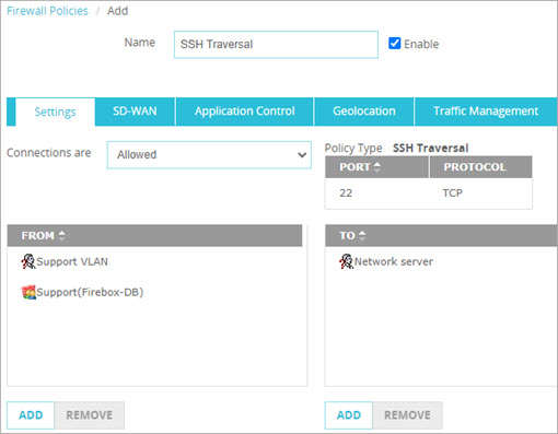 この例では、会社の IT サポート チームが使用している Support VLAN という VLAN があると仮定します。このチームは、特定のネットワーク サーバーに SSH プロトコルで接続できる必要があります。この会社に属する他のユーザーは、このサーバーへの SSH 接続を必要としません。このトラフィックを許可するには、SSH ポートとプロトコルを指定したカスタム Firebox ポリシーを追加します。ポリシーの 送信元 リストには、Support VLAN エイリアスのみを指定します。送信先 リストには、このチームが接続できる必要があるネットワーク サーバーを指定します。