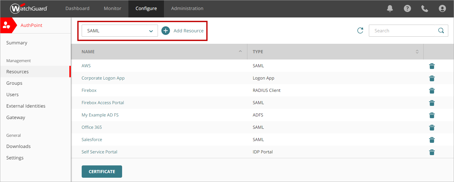 - AuthPoint ナビゲーション メニューから リソース を選択します。