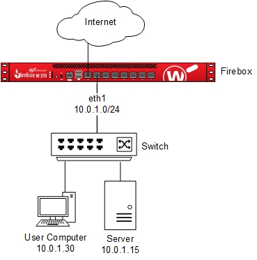 Firebox は、スイッチやルータの背後で発生するホスト内のトラフィックを処理しないことに留意してください。たとえば、Firebox を経由しないユーザー コンピュータと内部サーバー間のトラフィックがある場合、Firebox はそのトラフィックにポリシーを適用しません。この例では、Firebox ポリシーを使用して、ユーザーやグループからネットワーク リソースへの接続を許可または拒否することはできません。