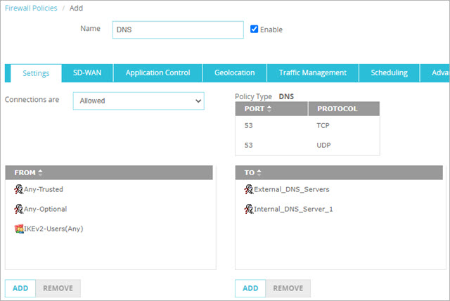 たとえば、このポリシーでは、内部およびリモート ユーザーによる、ローカルの DNS サーバー (Internal_DNS_Server_1) や、エイリアス External_DNS_Servers に含まれる複数の外部 DNS サーバーへの DNS トラフィックが許可されます。