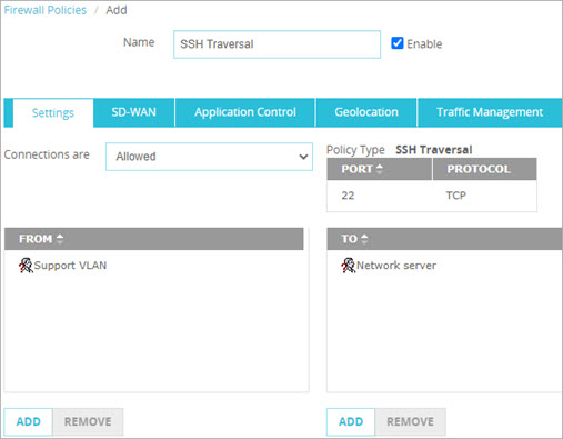 この例では、会社の IT サポート チームが使用している Support VLAN という VLAN があると仮定します。このチームは、特定のネットワーク サーバーに SSH プロトコルで接続できる必要があります。この会社に属する他のユーザーは、このサーバーへの SSH 接続を必要としません。このトラフィックを許可するには、SSH ポートとプロトコルを指定したカスタム Firebox ポリシーを追加します。ポリシーの 送信元 リストには、Support VLAN エイリアスのみを指定します。送信先 リストには、このチームが接続できる必要があるネットワーク サーバーを指定します。