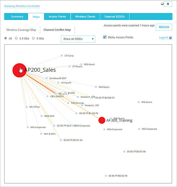 Gateway Wireless Controller の マップ ページに情報を表示するには、先に Firebox から AP のエリアをスキャンする必要があります: