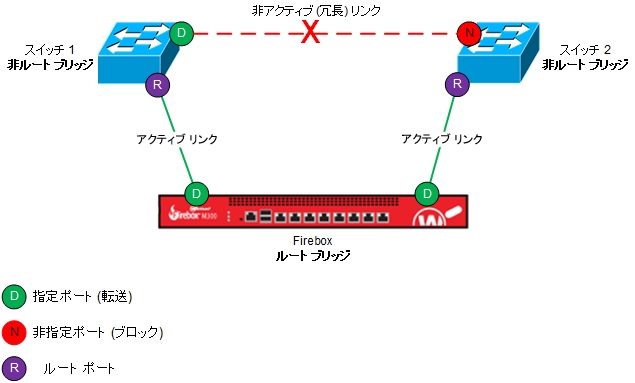 この図は、Firebox をルート ブリッジとするスパニング ツリーの簡単な実装を示しています。