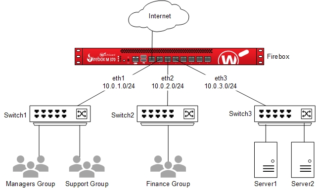セグメント化されたネットワークでは、Firebox から、セグメント間を流れる内部ネットワーク トラフィックを確認し、制御することができます。たとえば、eth1 LAN (10.0.1.0/24) 上のユーザー コンピュータと eth2 VLAN (10.0.2.0/24) 上のサーバー間のトラフィックを制御する Firebox ポリシーを追加することができます。Firebox でも、このトラフィックを監視することができます。