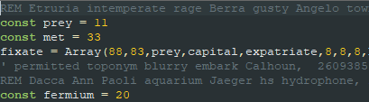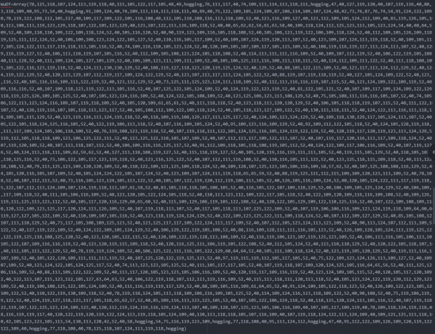 - A snippet of the original WuDT array as it is observed in the original script. Notice how there are dictionary words within the list of integers. The only one seen here is “hogging” which is equal to 18 as defined by a variable embedded within the script.