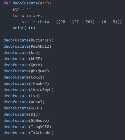 After extracting the 16 arrays from the script that are proceeded by an execute function, a Python script was hacked together to replicate the Ahmedabad721 function. Listed below, in order, are the functions that are executed with an emphasis on "WuDT" (More on that next). The small script in the image below prints out all of the functions in the script. The script can be found in the Malware Analysis GitHub repo linked above in the External Resources.