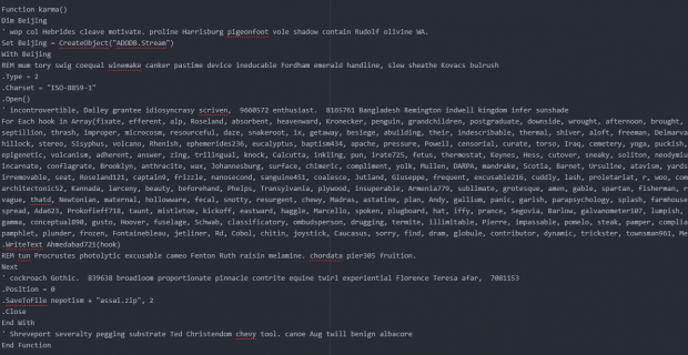 The file consists of gibberish dictionary words declared as variables, inputted as comments, and large arrays consisted of integers and other words masked as integers. The images below show what is seen upon opening the file.