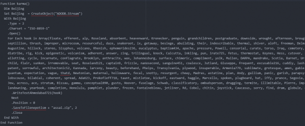 Knowing that the WuDT function is the only one that produces another file, one can assume this is the ultimate malicious file being dropped. Since this function only creates a file, the other execute functions (not WuDT) can be commented out and the original VBS can be executed to produce the resulting file WuDT produces. Ultimately, an entire zip folder named “assai.zip” was generated.