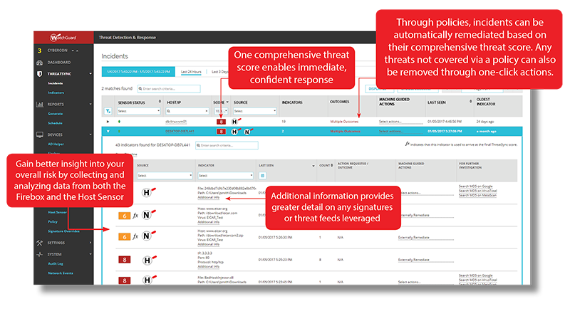From distributed enterprises with 10 branch offices to small and midsize businesses (SMBs) with employees working outside of the network, it can be a struggle to manage security consistently and cohesively across your organization. It is critical for SMBs and distributed enterprise organizations to not only have visibility into both their network and endpoint event data, but to be able to quickly and efficiently leverage actionable insight to remove threats. ThreatSync, a critical component of TDR, collects event data from the WatchGuard Firebox, Host Sensor and enterprise-grade threat intelligence feeds, analyzes this data using a proprietary algorithm, and assigns a comprehensive threat score and rank. This powerful correlation engine enables cloud-based threat prioritization to empower IT team to quickly and confidently respond to threats.