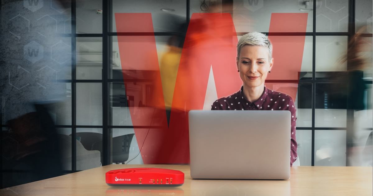 Woman with short white hair working at a laptop with a WatchGuard Cloud icon on the back and a red Firebox T115-W on the desk