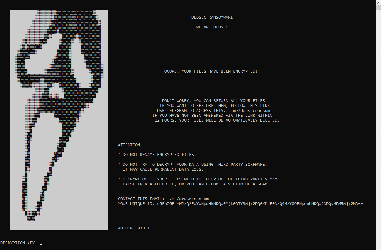 Upon execution, the ransomware attempts to play a sound as it encrypts files and changes the file names with a concatenated ".dedsec" extension. Furthermore, the ransom note is part of the executable; it doesn't "drop" a ransom note. It simply displays the ransom note in the application window with the same name as the executable. For fans of Scream and Ghostface, you'll recognize the ASCII art within the ransom note. This ransom note is mirrored as the desktop wallpaper too. So, you can't miss it. The ransom note tells victims to contact the threat actor(s) via Telegram.