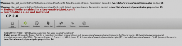 This section is intertwined with the INSTALL.sh script covered above but expands on other processes to be set up, primarily the need of requiring authenticated access to certain resources. This is done via files known as .htaccess. These files allow Apache web servers to do many things, of which one is to ensure authentication requirements. There needs to be a unique password file for customers (customer.passwd) as well as backend admin panel (panel.passwd) access. Another step is to go into the SQL folder and carry out its README.txt file, but we’re skipping this for now as it’ll be covered in a separate section. Then there are two changes that need to be edited in the respective configuration file for an already-existing TestUser account. One of the two changes is to modify information for the respective user’s database, which will be covered in another section with the SQL directory, and the other to establish a directory path to the /base/bot/ directory covered above. There is an explicit note to not delete anything within the data structure, doing so may prevent full functionality of the backend panel and the customer panel accounts. Further, there are instructions on how to enable the C++ standard library to allow for Android OS development, libc++.so. Lastly, we need to direct Apache2 to our /var/data/sites-enabled/ directory where our own virtual hosts files are stored. Still needing to get much work done, I at least got the display of the control panel up and working (Figure 8).
