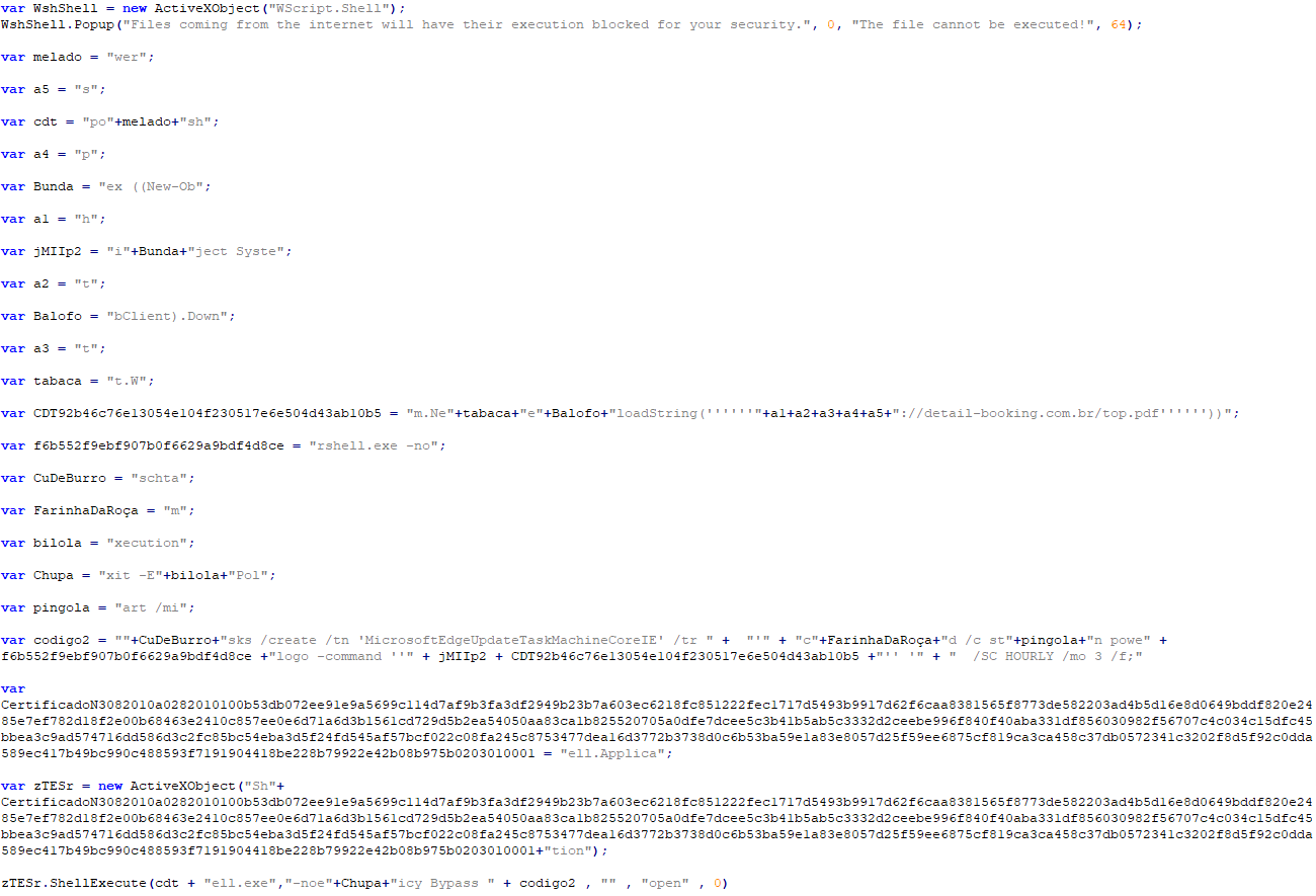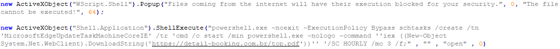- The second ActiveX object executes a PowerShell command that creates a task named 'MicrosoftEdgeUpdateTaskMachineCoreIE.' It uses this task to execute another PowerShell command that downloads a file from ‘detail-booking[.]com[.]br/top.pdf.’ It tries to download this file every three hours.
