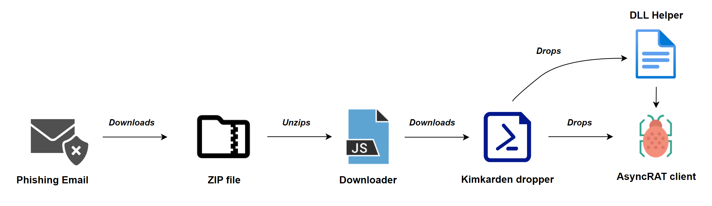 This post will show my research on the infection chain, from the initial JavaScript downloader to the dropper, which I call the ‘kimkarden’ dropper. I’ll show how the dropper operates and then show you some IoCs I found. I didn’t analyze the AsyncRAT sample much because it is, unfortunately, still publicly available on GitHub.