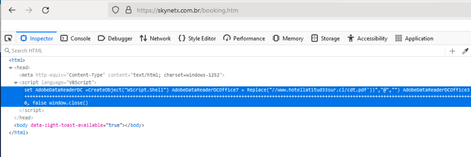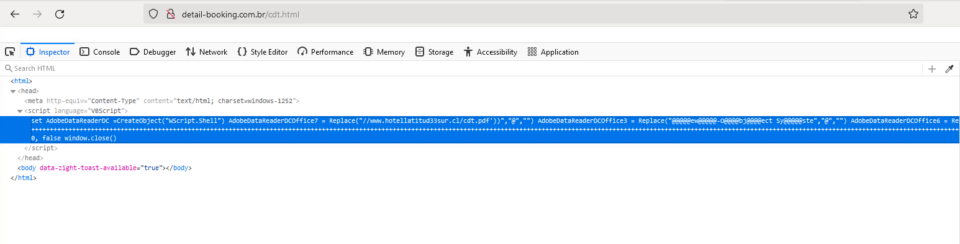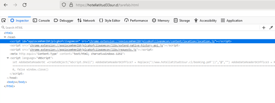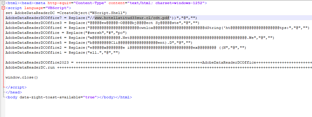 After analyzing this malware campaign, I looked into the C2 domains and the domains hosting the droppers. To be frank, I googled the domains to see if there were any other analyses from other researchers. I also looked through the ‘Relations’ tab in VirusTotal to see if I could find any other files communicating with these domains. One of the relations was an HTML file located on the same domain the Kimkarden dropper was on. This contained a script that downloaded a PDF from a different domain, a legitimate domain of a hotel in Chile.