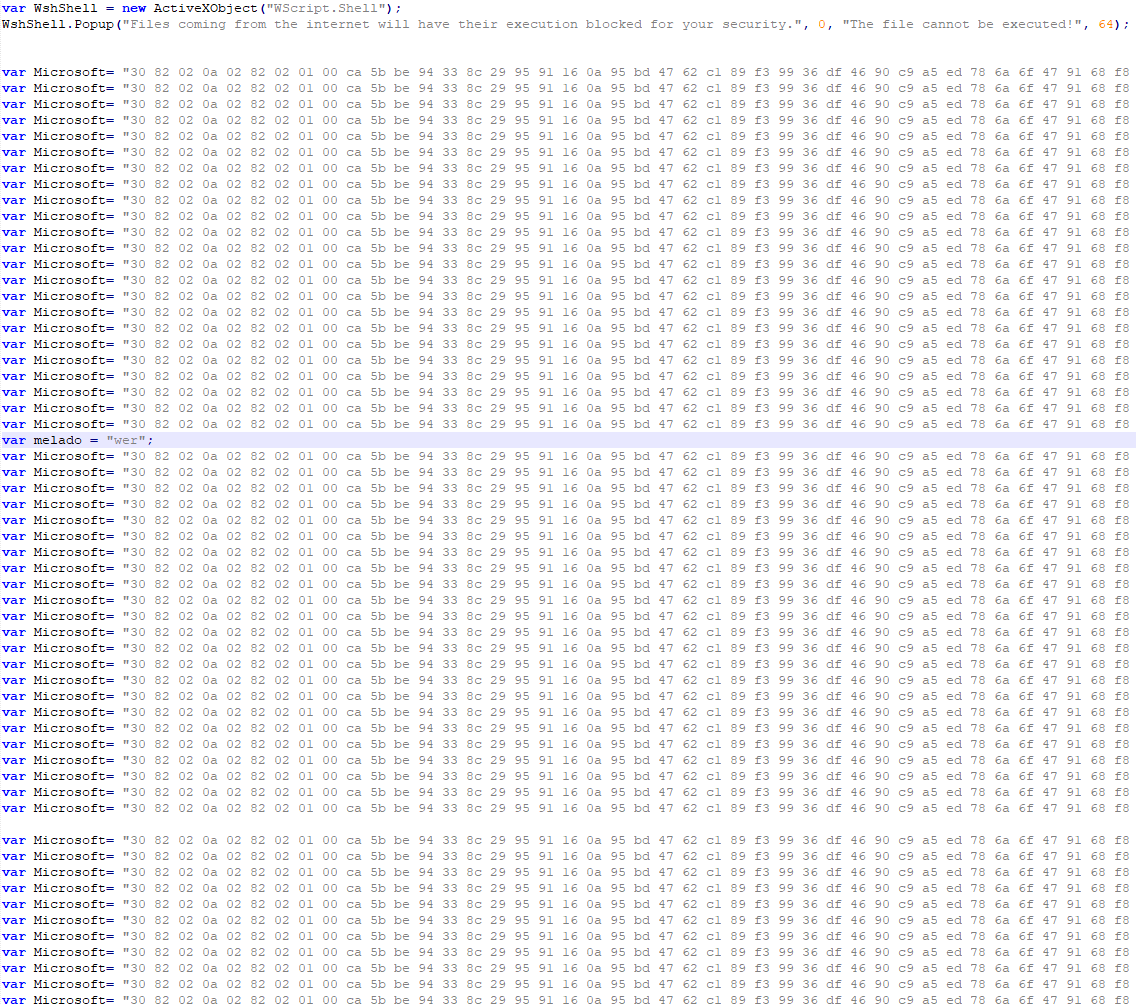 - Creates a new ActiveX object that invokes a popup titled “The file cannot be executed,” and the message “Files coming from the internet will have their execution blocked for your security.” This tricks the user into thinking that the file didn’t actually execute, providing a false sense of security.