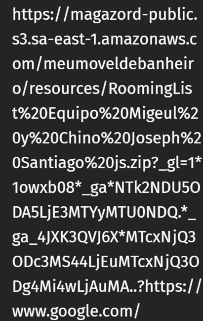 | magazord-public[.]s3[.]sa-east-1[.]amazonaws[.]com/meumoveldebanheiro/resources/RoomingList%20Equipo%20Migeul%20%20Chino%20Joseph%20Santiago%20js.zip?_gl=1*1owxb08*_ga*NTk2NDU5ODA5LjE3MTYyMTU0NDQ.*_ga_4JXK3QVJ6X*MTcxNjQ3ODc3MS44LjEuMTcxNjQ3ODg4Mi4wLjAuMA..?https://www.google.com/ | Phishing email ZIP file download location |